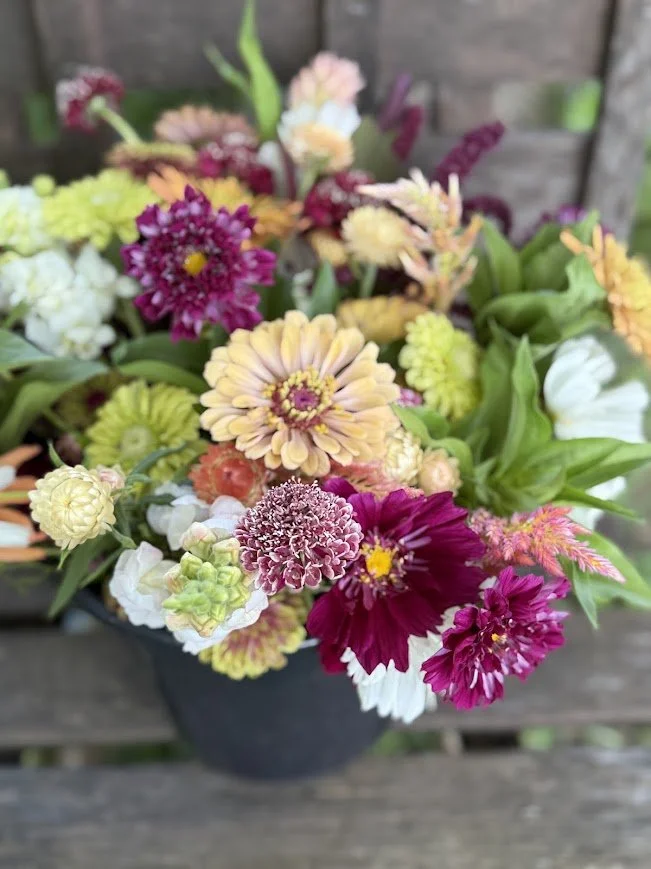 Flower Bucket $40 and are available for pick up at the farm store on Fridays and Saturdays.