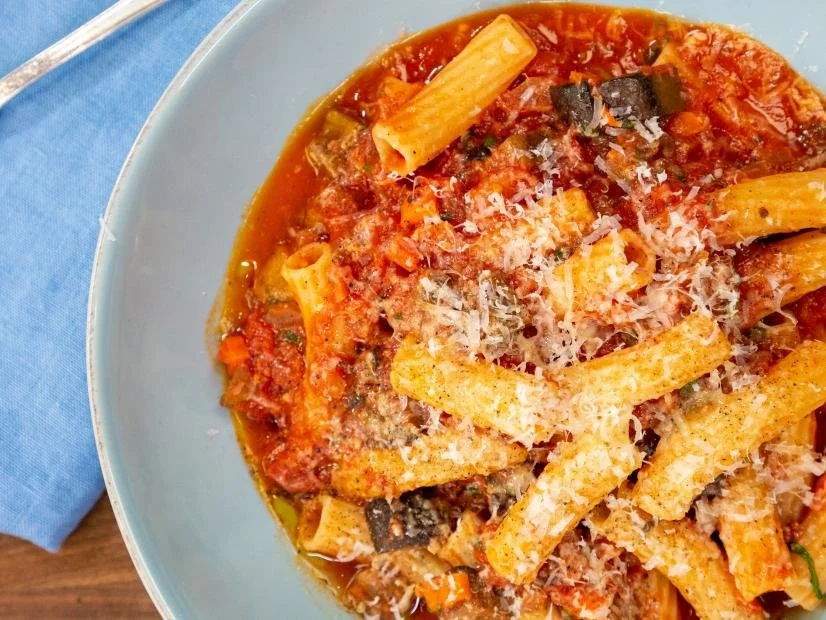 Fold the eggplant, basil and oregano into the sauce. Add the pasta and some of the Parmigiano-Reggiano; toss to coat with the sauce, adding some of the reserved pasta water, as needed, to thin the sauce. Season with salt and pepper. Transfer to shallow bowls and serve, passing the remaining Parmigiano at the table.